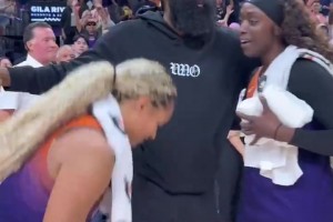 登哥开心得嘞!哈登看完女篮比赛,和两位女篮球员分别拥抱!
